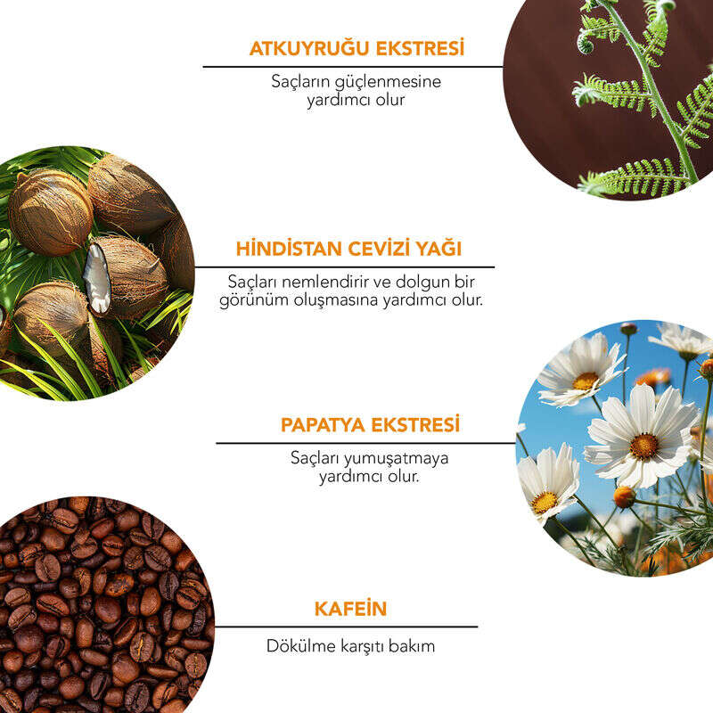 At kuyruğu ekstresi, kafein,duvar sarmaşığı,hindistan cevizi yağı.