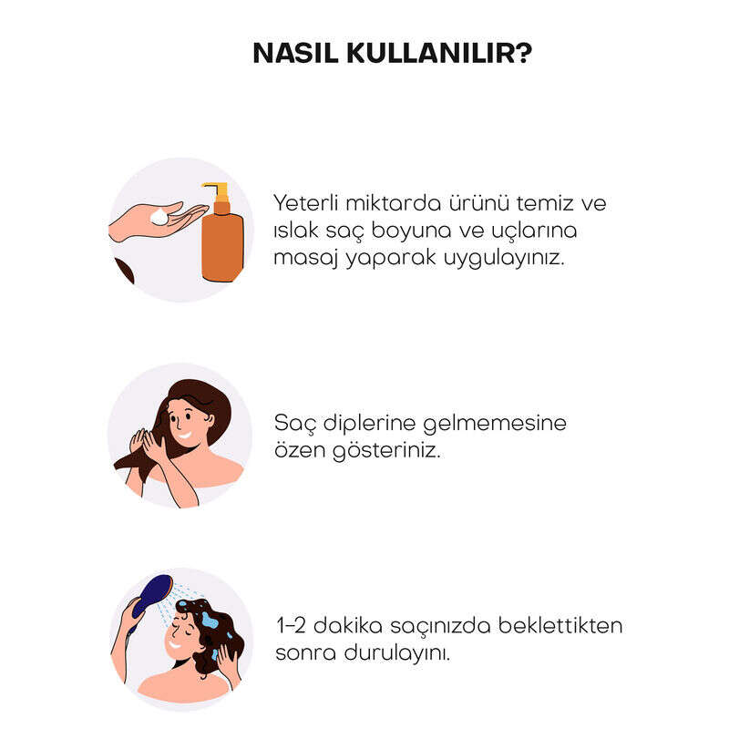 Yeterli miktarda ürünü temiz ve ıslak saç boyuna ve uçlarına masaj yaparak saç diplerine gelmeyecek şekilde uygulayınız.