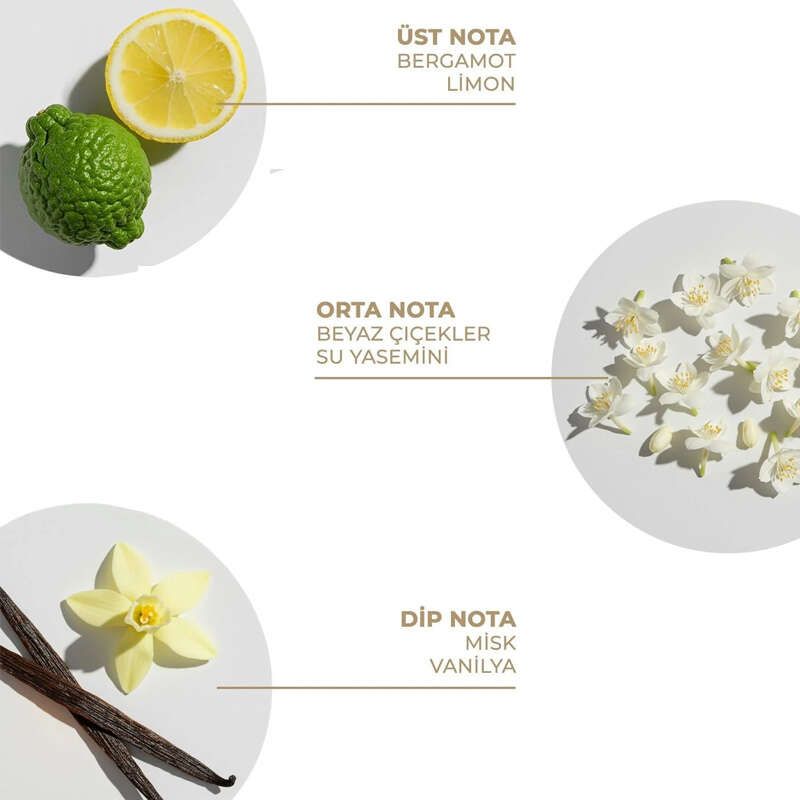 Bergamot, Limon, Beyaz Çiçekler, Vanilya gün boyu süren zarafet sunar.