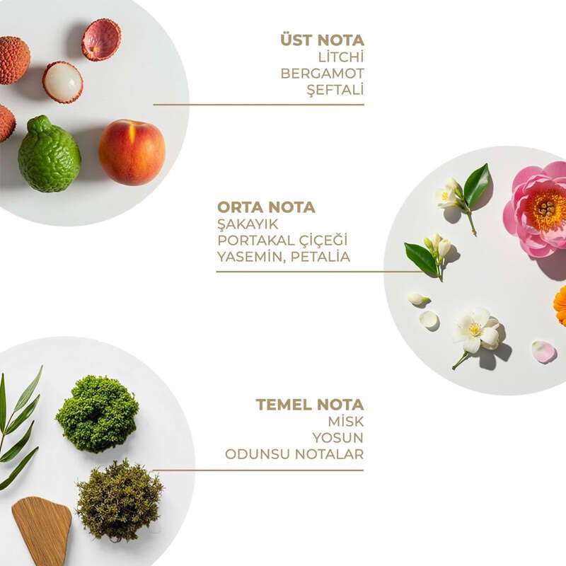 Litchi, Bergamot, şeftali, şakayık, portakal çiçeği, yasemin, petalia, misk, yosun, odunsu notalarla dengelenerek zarif bir ferahlık sunar. Hızlıca emilir ve cildin uzun süre güzel kokmasını sağlayarak, güne tertemiz bir başlangıç yapmanıza yardımcı olur.