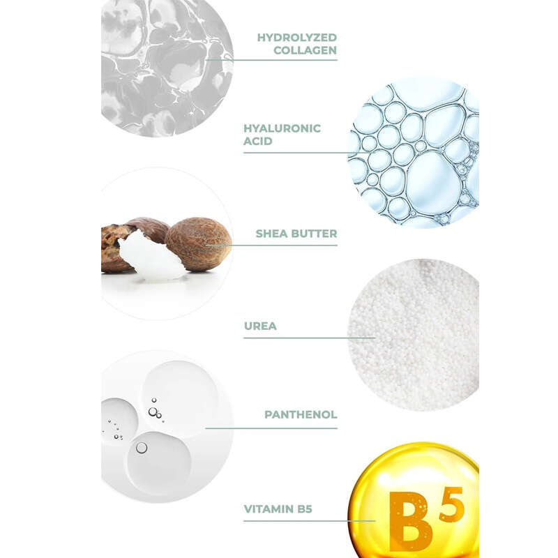 Aqua, Coco-Caprylate, Dicaprylyl Carbonate, Glyceryl Stearate, Glycerin, Butyrospermum Parkii (Shea) Butter, Pentylene Glycol, Cetearyl Alcohol, Ceteareth-20, Ceteareth-12, Hydrolyzed Collagen, Trehalose, Urea, Serine, Glyceryl Polyacrylate, Algin, Caprylyl Glycol, Sodium Hyaluronate, Panthenol, Pullulan, Disodium Phosphate, Potassium Phosphate, Sodium Stearoyl Glutamate, Sodium Polyacrylate, Phenoxyethanol, Allantoin, Parfum, Xanthan Gum, Ethylhexylglycerin