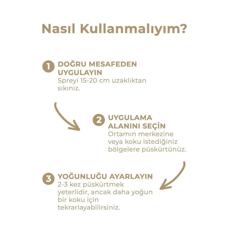 Genellikle 2–3 kez püskürtmek yeterlidir; daha yoğun bir koku için uygulamayı tekrarlayabilirsiniz.