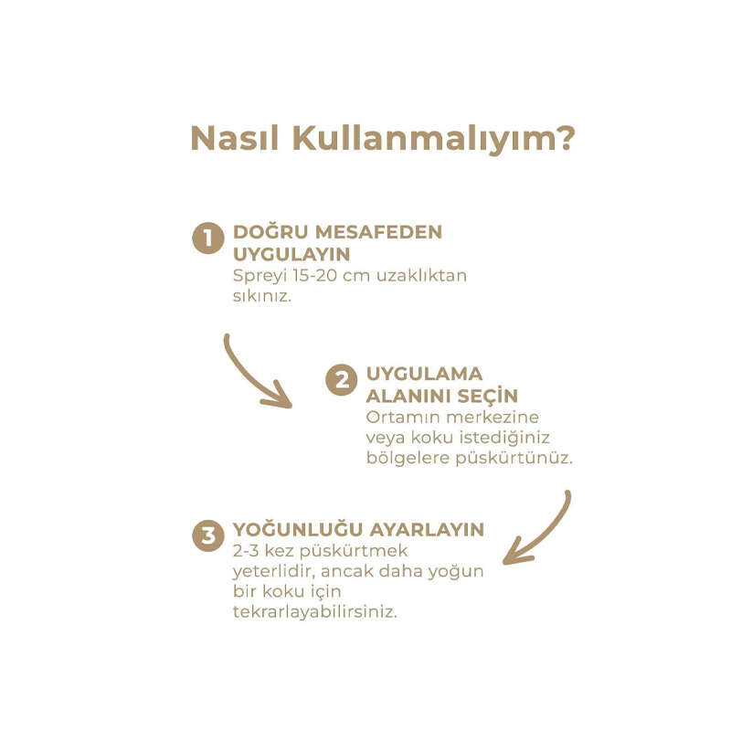 Spreyi ortamın merkezine veya hoş bir koku istediğiniz bölgelere doğru püskürtün.