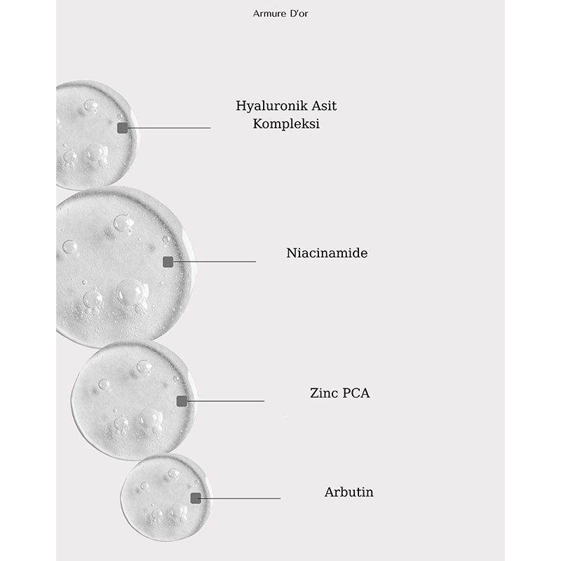 Armure Dor konstantre serum, leke ve renk eşitsizliği görünümünü hedef alarak cildin doğal ışıltısını ortaya çıkarır. Glikolik asit, traneksamit asit ve arbutin ile zenginleştirilmiş formülü, düzenli kullanımda cilt tonunu eşitlemeye yardımcı olur. İçeriğinde bulunan hyaluronik asit kompleksi ve diğer değerli bitki özleri ile cilt bakım ihtiyacınızı karşılar.Kullanım Şekli: