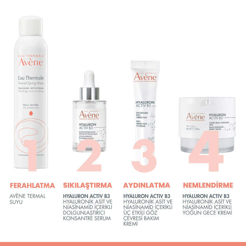 Hyaluron Activ B3 Hyaluronik Asit ve Niasinamid İçerikli Yoğun Gece Kremi Ürün İçeriği: • Avene Termal Su • %2 Niasinamid • Hyaluronik Asit • Haritaki Ekstresi • Retinaldehit