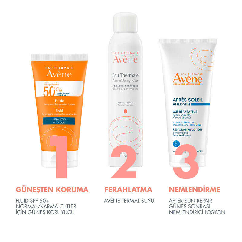 Fluid SPF 50+ Normal / Karma Ciltler için Güneş Koruyucu Ürün İçeriği: • Avène Termal Su • TriAsorB • Tinosorb S • Uvinul A+ • Uvinul T150 • Pre-tokoferil