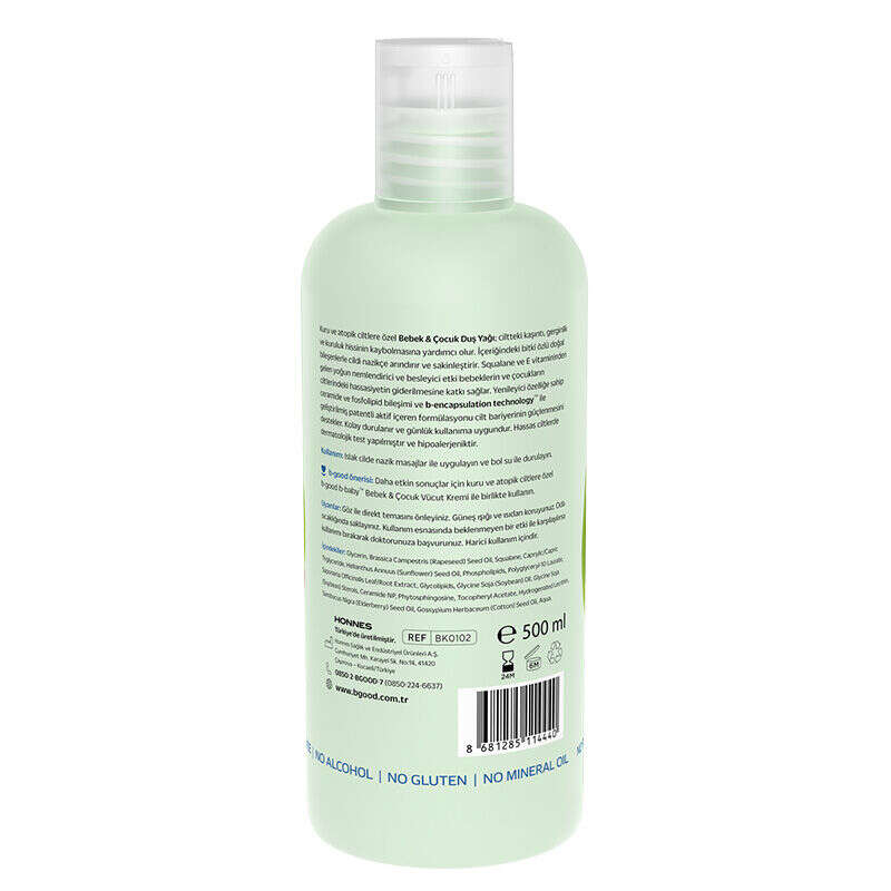 - b-good b-baby bebek ve çocuk duş yağı, kuru ve atopiye yatkın ciltler için özel olarak formüle edilmiştir.