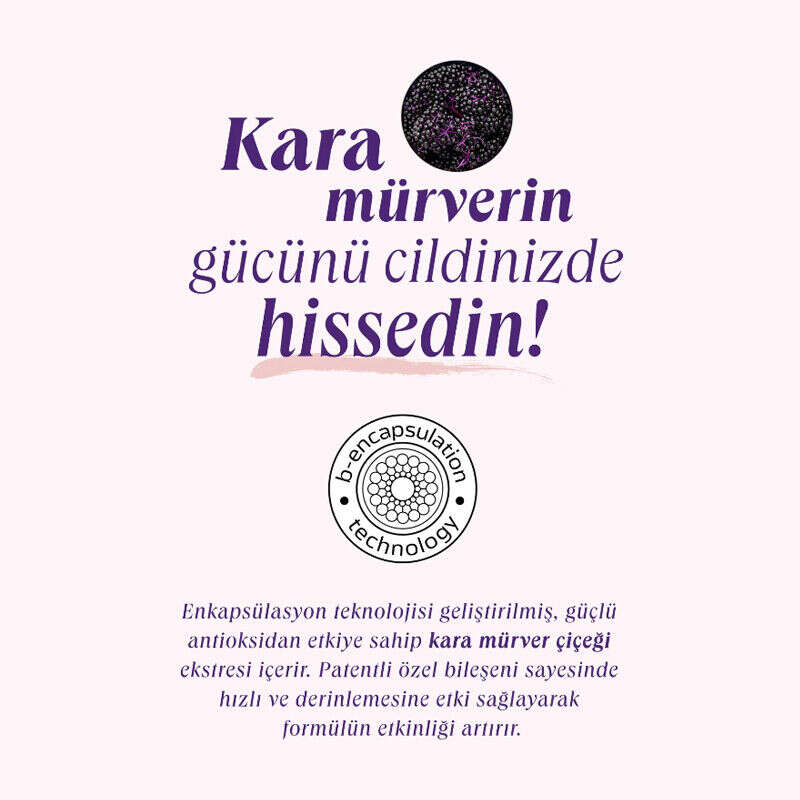 - Güçlü bir antioksidan kaynağı, kara mürver ekstresi ile tasarlanmış patentli aktif bileşen S²ambiumTM içeriğine sahip b-encapsulation technologyTM ile geliştirilmiştir.