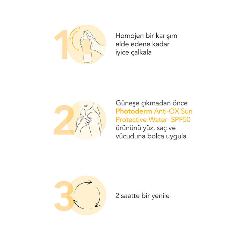 Kullanım Şekli: ADIM 1 Homojen bir karışım elde edene kadar İYİCE ÇALKALAYINIZ. ADIM 2 Güneşe çıkmadan önce ürünü bolca uygulayınız. Yüzünüze uygulamadan önce ellerinize spreyi sıkınız ve sonrasında uygulayınız. ADIM 3 Yüzme, terleme ve havluyla kurulama sonrası tekrar uygulanmalıdır. Kumaş ile temas etmemesi önerilir.