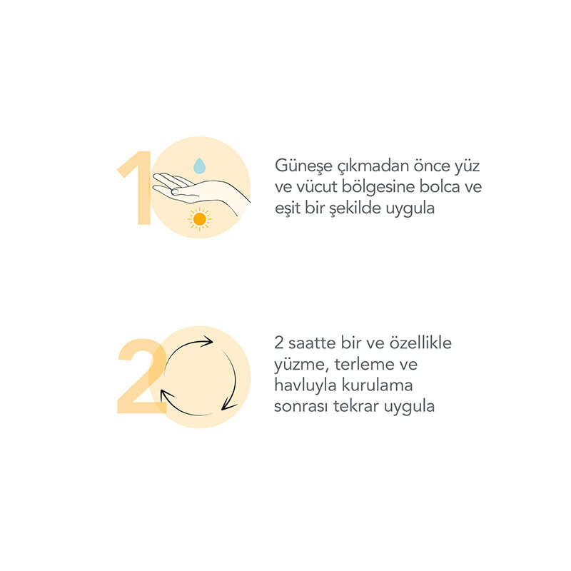 Güneşe çıkmadan önce yüz ve vücut bölgesine bolca ve eşit bir şekilde uygulayınız.