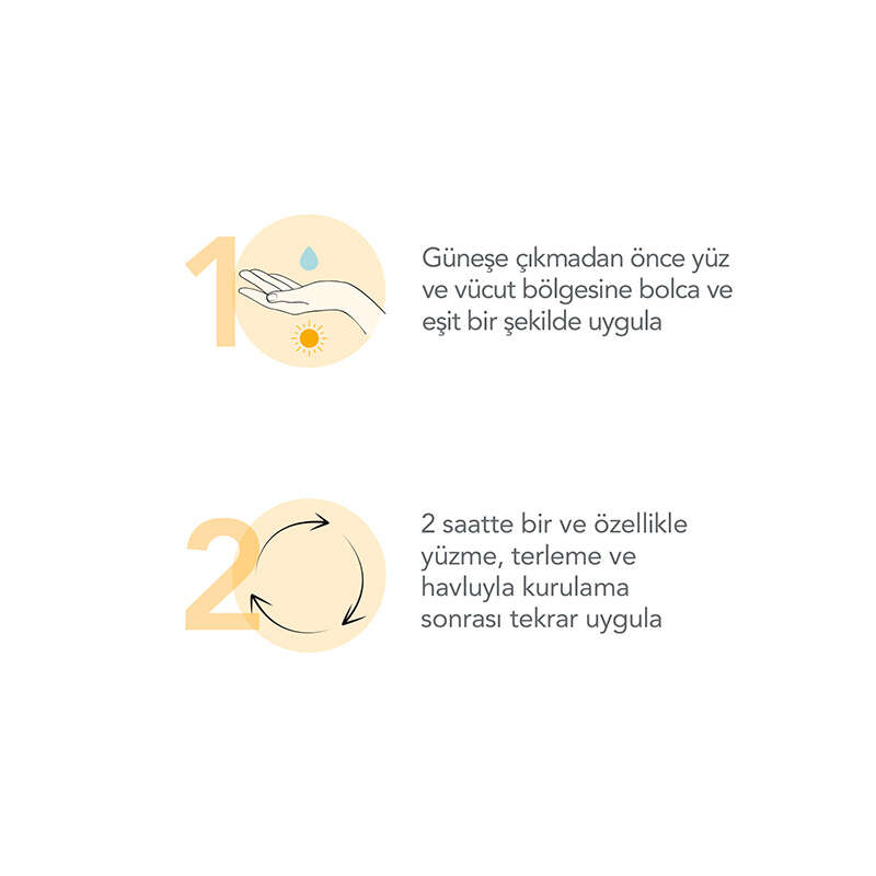 2 saatte bir ve özellikle yüzme ve havluyla kurulama sonrası tekrar uygulanmalıdır. Gözlere direkt temas ettirilmemelidir.