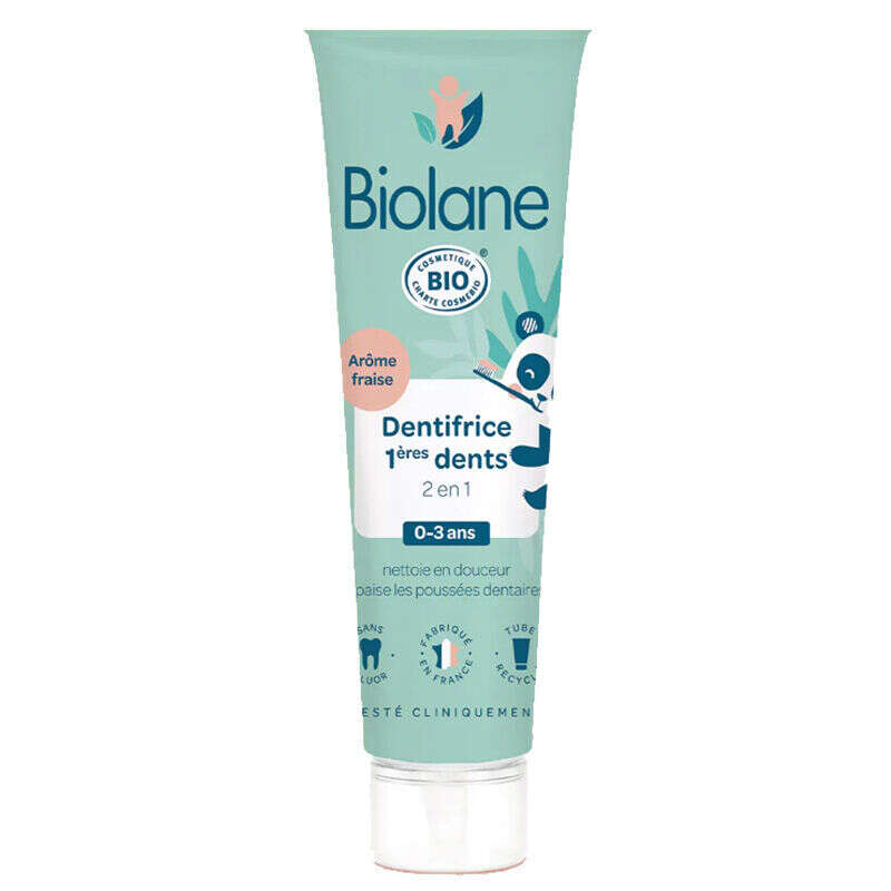 Organik Sertifikalı Biolane 2’si 1 arada Diş Macunu bebeğinizin süt dişlerini nazikçe temizler ve diş çıkarmadan kaynaklanan damaktaki hassasiyete karşı bakım sağlar.