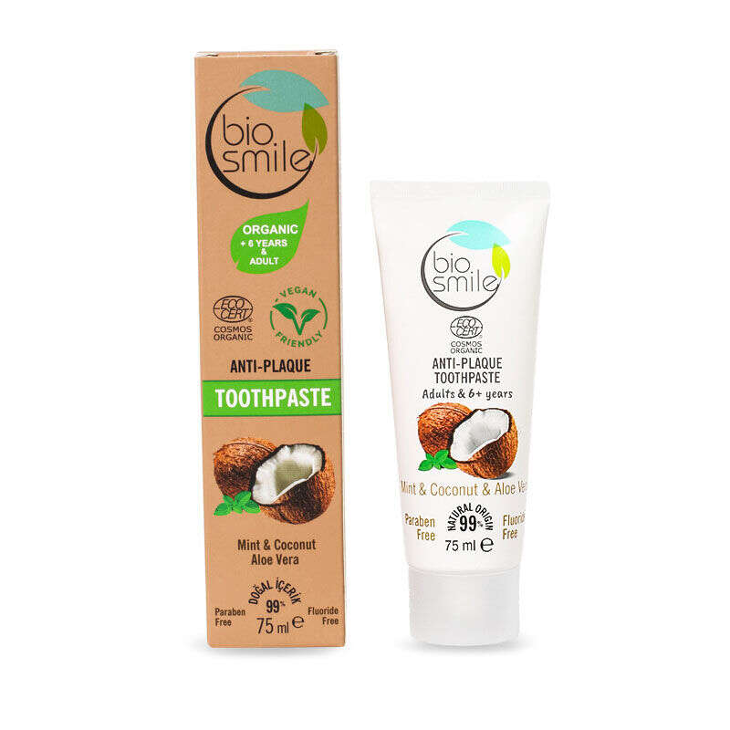 Sertifikalı organik anti-plak diş macunu içeriğindeki hindistancevizi yağı ve çinko tuzu ile günlük ağız bakımınızı yapar.