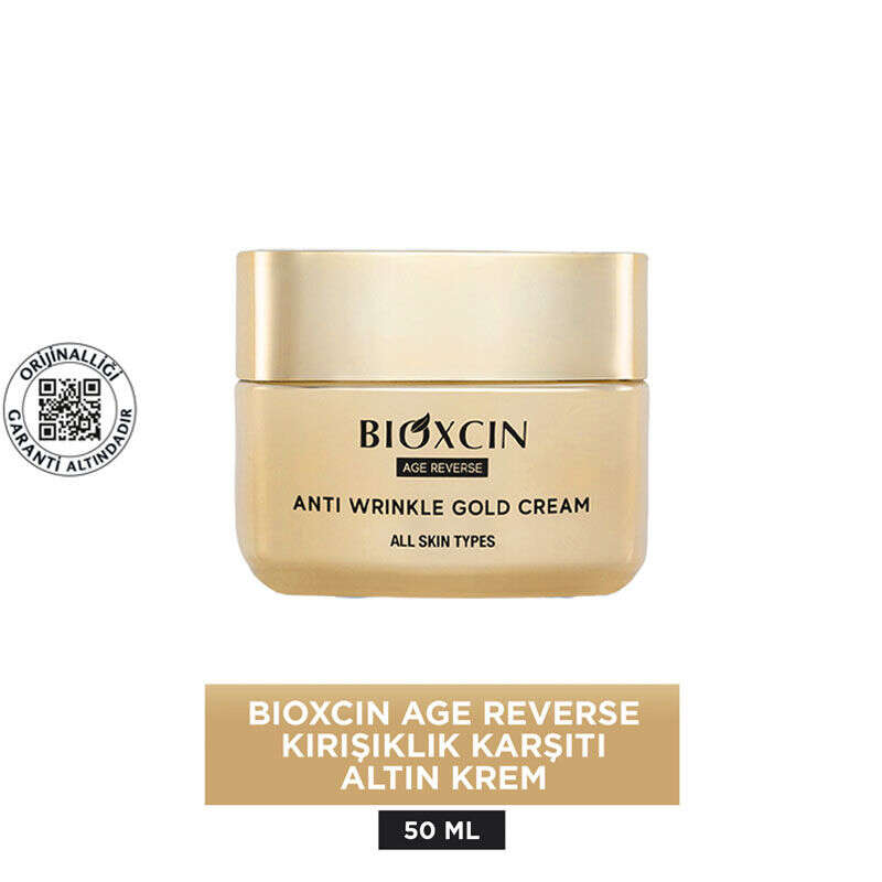 Bioxcin Age Reverse Kırışıklık Karşıtı Altın Krem, içeriğindeki 24K Altın ve İpek Proteini ile cildi sıkılaştırır ve dolgunlaştırır.