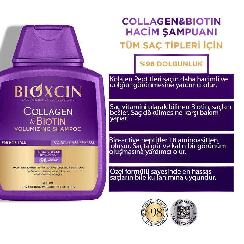 Bioxcin Collagen & Biotin Hacim Şampuanı; ince telli, hacimsiz ve güçsüz saçları içeriğindeki Hidrolize Kolajen, Biotin ve Bio-Active Peptitler ile dolgunlaştırır ve güçlendirir.