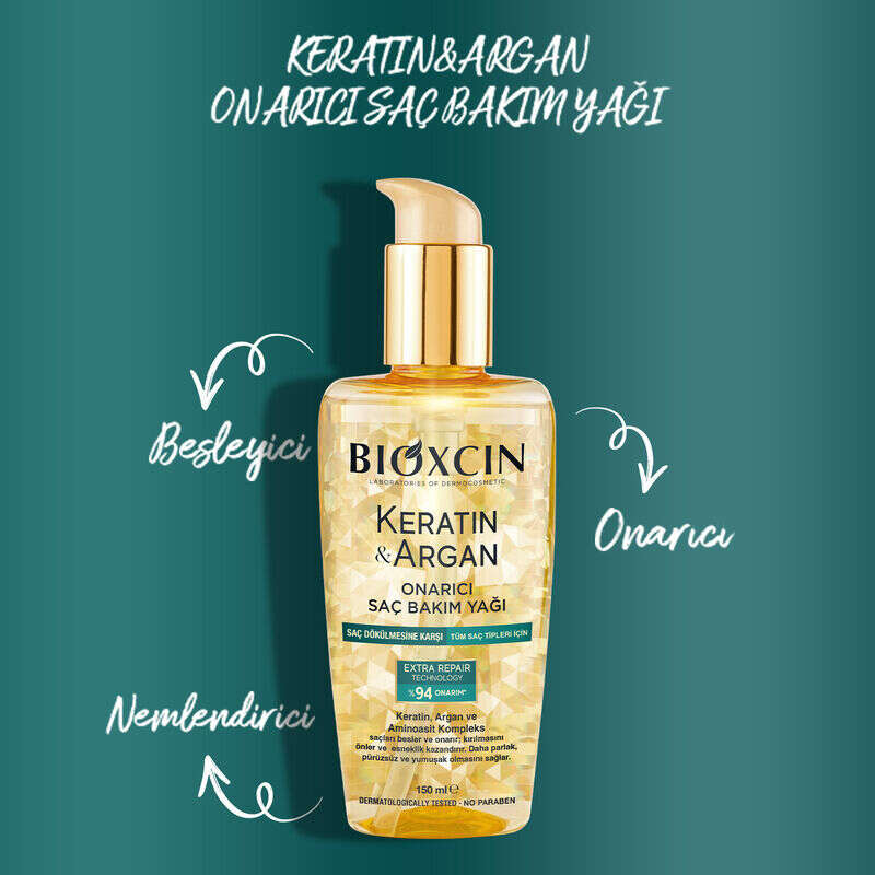 - Bioxcin Keratin & Argan Saç Bakım Yağı, canlılığını ve nemini kaybetmiş, yıpranma belirtileri gösteren saçlara özel olarak formüle edilmiştir. İçeriğinde yer alan hidrolize keratin ve argan yağı ile saç tellerini ağırlaştırmadan beslemeye ve saçın nem dengesini korumasına yardımcı olur.