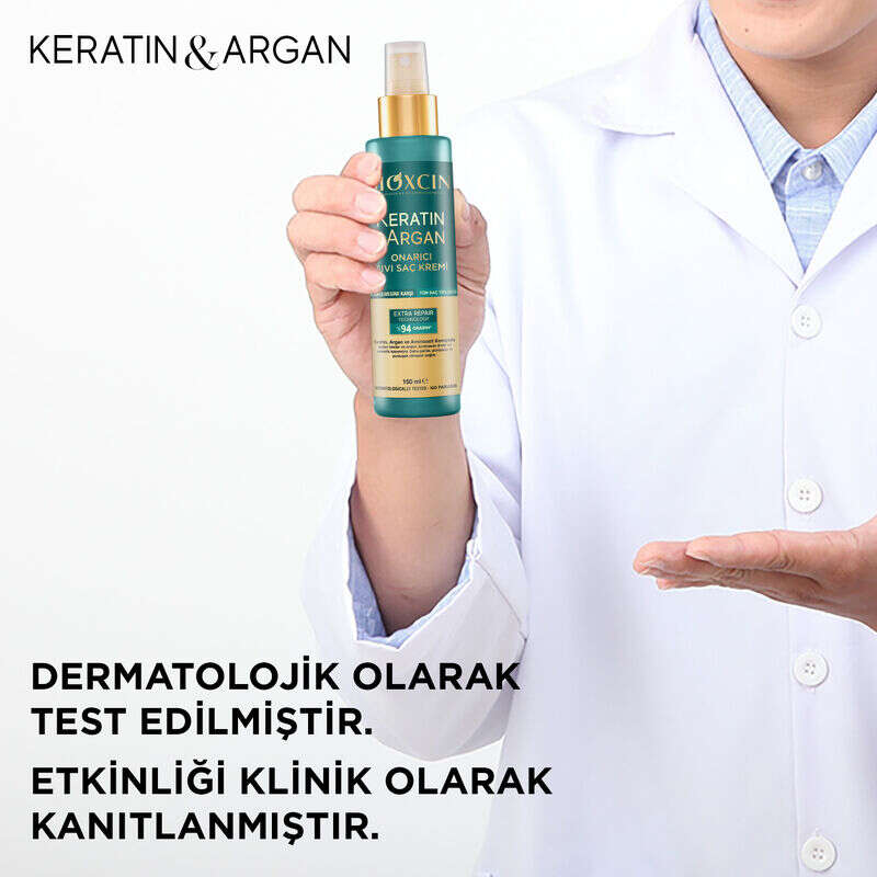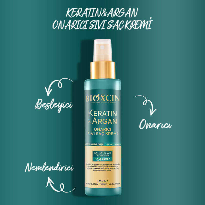 Bioxcin Keratin ve Argan Sıvı Saç Kremi; yıpranmış, ışıltısını ve nemini kaybetmiş saçları içeriğindeki hidrolize keratin ve argan yağı ile besler ve nemlendirir.
