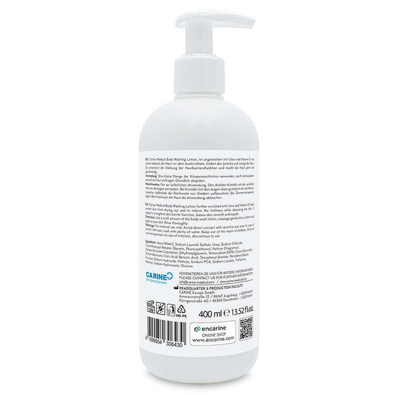 CARINE Vücut Yıkama Losyonu, Üre ve E Vitamini ile zenginleştirilmiş formüle sahiptir.