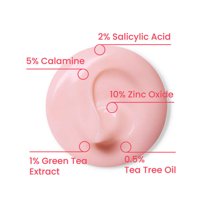 Isopropyl Alcohol, Aqua, Zinc Oxide, Calamine, Glycerin, Salicylic Acid, Zinc PCA, Melaleuca Alternifolia Leaf Oil, Allantoin, Sulfur, Camphor, Camellia Sinensis Leaf Extract, Phenoxyethanol, Ethylhexylglycerin, Potassium Sorbate, Sodium Benzoate.