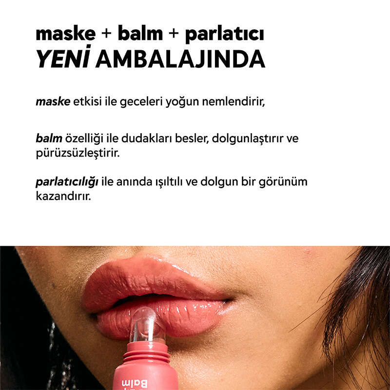 Gündüz ve gece ipeksi ve yumuşak dudaklar için hyalüronik asit ve seramid içeren, dudağı renklendiren, 3 etki 1 arada nemlendirici, parlatıcı dudak balsamı. #FeedYourSkin