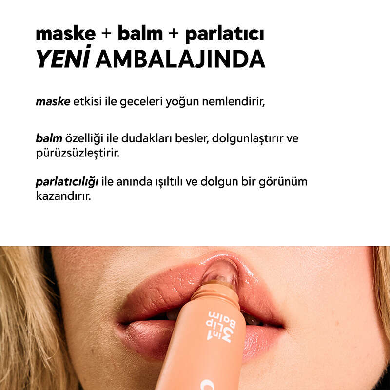 - Gündüz ve gece ipeksi, yumuşak ve dolgun dudaklar için, hyalüronik asit ve seramid içeren, nemlendirici bileşenlerle formüle edilmiş 3in1 Lip Balm dudakları besler, parlatır, nemlendirir.
