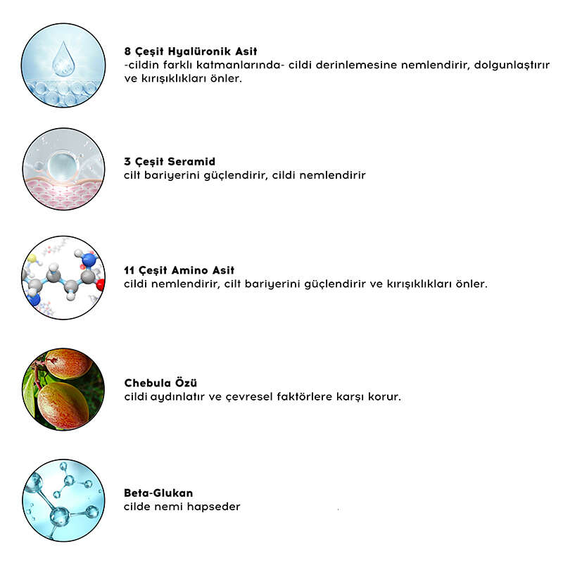 - 8 Çeşit Hyalüronik Asit cildi nemlendirir. Cildin elastikiyetini korumasına yardım eder. Cildi pürüzsüzleştirmeye yardımcı olur. Doğal bir antioksidan özelliği sağlar.