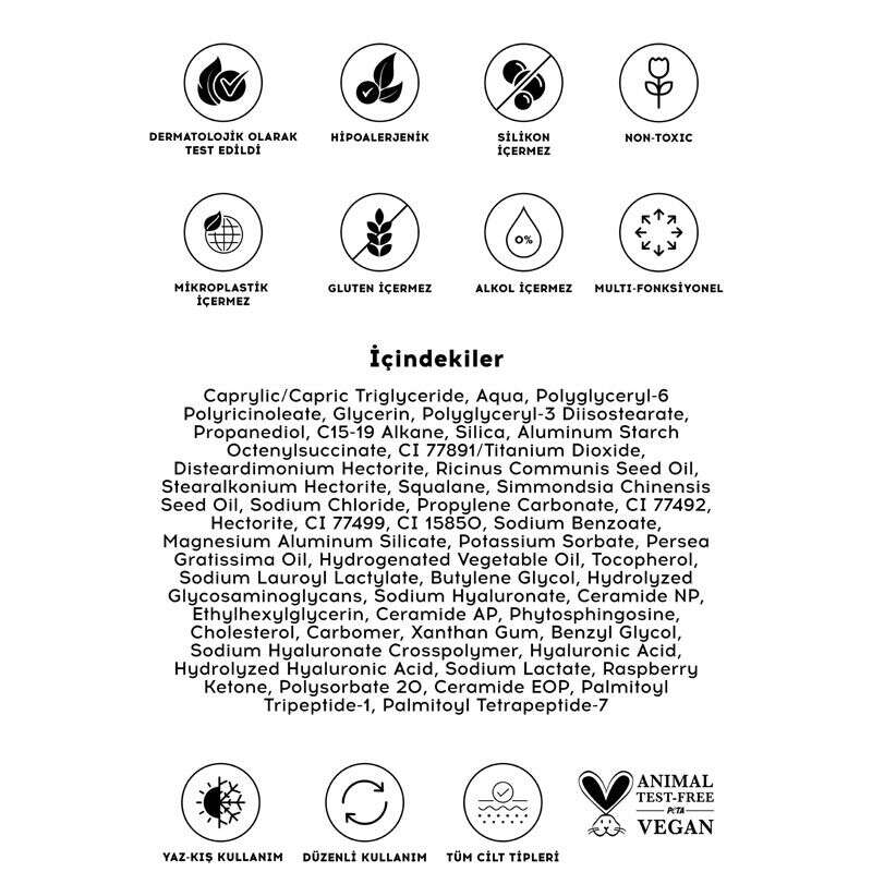 Caprylic/Capric Triglyceride, Aqua, Polyglyceryl-6 Polyricinoleate, Glycerin, Polyglyceryl-3 Diisostearate, Propanediol, C15-19 Alkane, Silica, Aluminum Starch Octenylsuccinate, CI 77891/Titanium Dioxide, Disteardimonium Hectorite, Ricinus Communis Seed Oil, Stearalkonium Hectorite, Squalane, Simmondsia Chinensis Seed Oil, Sodium Chloride, Propylene Carbonate, CI 77492, Hectorite, CI 77499, CI 15850, Sodium Benzoate, Magnesium Aluminum Silicate, Potassium Sorbate, Persea Gratissima Oil, Hydrogenated Vegetable Oil, Tocopherol, Sodium Lauroyl Lactylate, Butylene Glycol, Hydrolyzed Glycosaminoglycans, Sodium Hyaluronate, Ceramide NP, Ethylhexylglycerin, Ceramide AP, Phytosphingosine, Cholesterol, Carbomer, Xanthan Gum, Benzyl Glycol, Sodium Hyaluronate Crosspolymer, Hyaluronic Acid, Hydrolyzed Hyaluronic Acid, Sodium Lactate, Raspberry Ketone, Polysorbate 20, Ceramide EOP, Palmitoyl Tripeptide-1, Palmitoyl Tetrapeptide-7