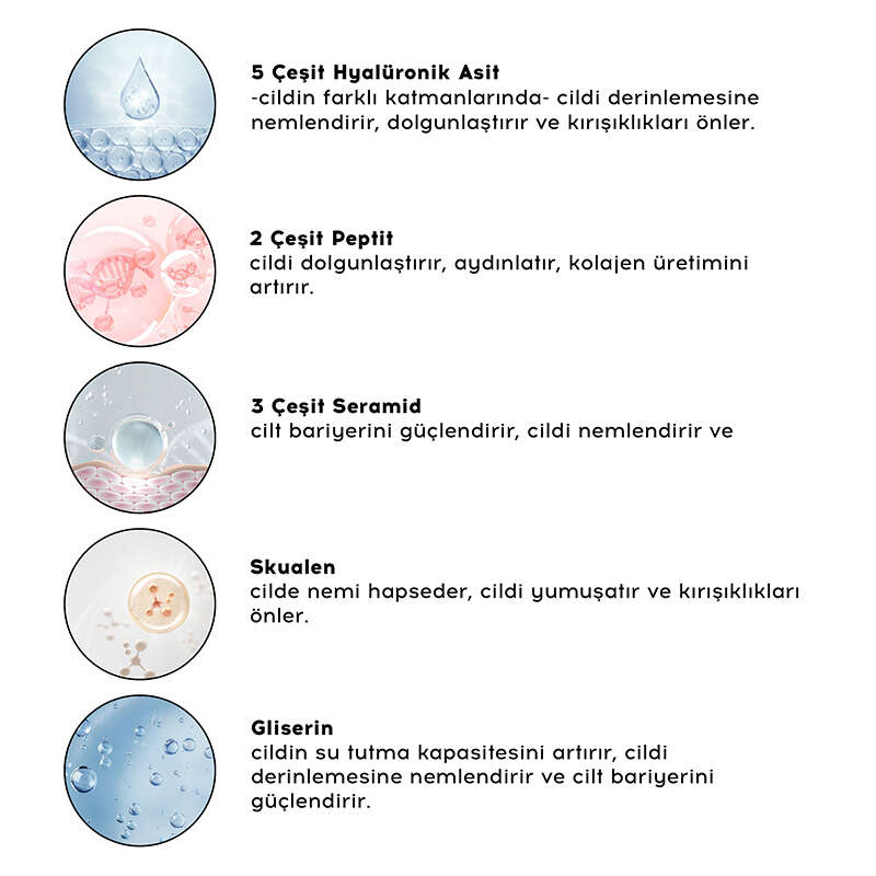 5 Çeşit Hyalüronik Asit cildi nemlendirir. Cildin elastikiyetini korumasına ve cildi pürüzsüzleştirmeye yardımcı olur. Doğal bir antioksidan özelliği sağlar.