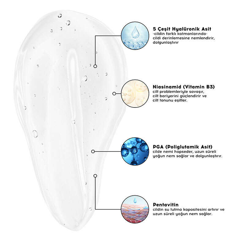 Moisturizer 5 çeşit hyalüronik asit: Yoğun nem ve dolgun görünüm sağlar. Niasinamid (Vitamin B3): Cilt problemleriyle savaşır, bariyeri güçlendirir. Panthenol (Vitamin B5): Nemlendirir Patentli Skin Barrier Technology™: Cilt bariyerini güçlendirir.