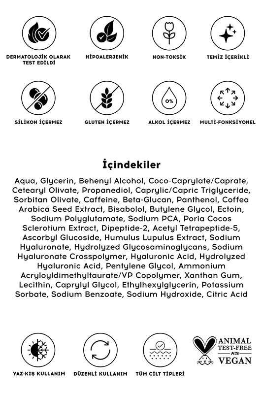 Aqua, Glycerin, Behenyl Alcohol, Coco-Caprylate/Caprate, Cetearyl Olivate, Propanediol, Caprylic/Capric Triglyceride, Sorbitan Olivate, Caffeine, Beta-Glucan, Panthenol, Coffea Arabica Seed Extract, Bisabolol, Butylene Glycol, Ectoin, Sodium Polyglutamate, Sodium PCA, Poria Cocos Sclerotium Extract, Dipeptide-2, Acetyl Tetrapeptide-5, Ascorbyl Glucoside, Humulus Lupulus Extract, Sodium Hyaluronate, Hydrolyzed Glycosaminoglycans, Sodium Hyaluronate Crosspolymer, Hyaluronic Acid, Hydrolyzed Hyaluronic Acid, Pentylene Glycol, Ammonium Acryloyldimethyltaurate/VP Copolymer, Xanthan Gum, Lecithin, Caprylyl Glycol, Ethylhexylglycerin, Potassium Sorbate, Sodium Benzoate, Sodium Hydroxide, Citric Acid