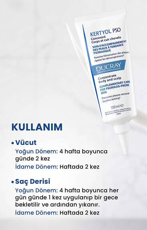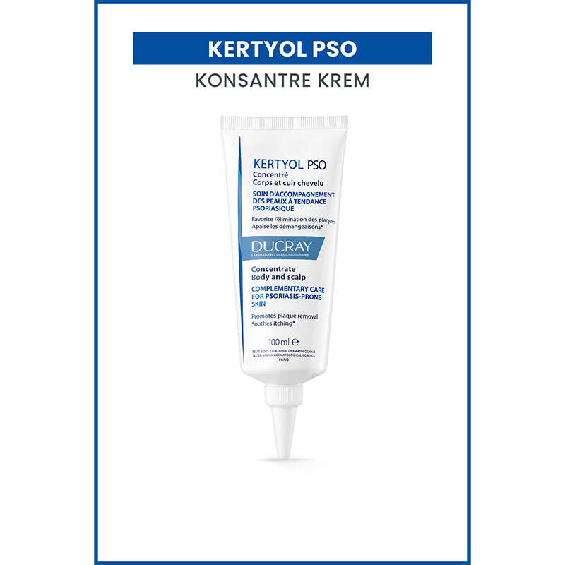Ducray Kertyol PSO Konsantre Krem, vücuttaki kuru (dirsekler, dizler, kaval kemiği bölgesi, vb.) ya da saç derisine doğrudan uygulama için tamamlayıcı bakım olarak geliştirilmiştir.