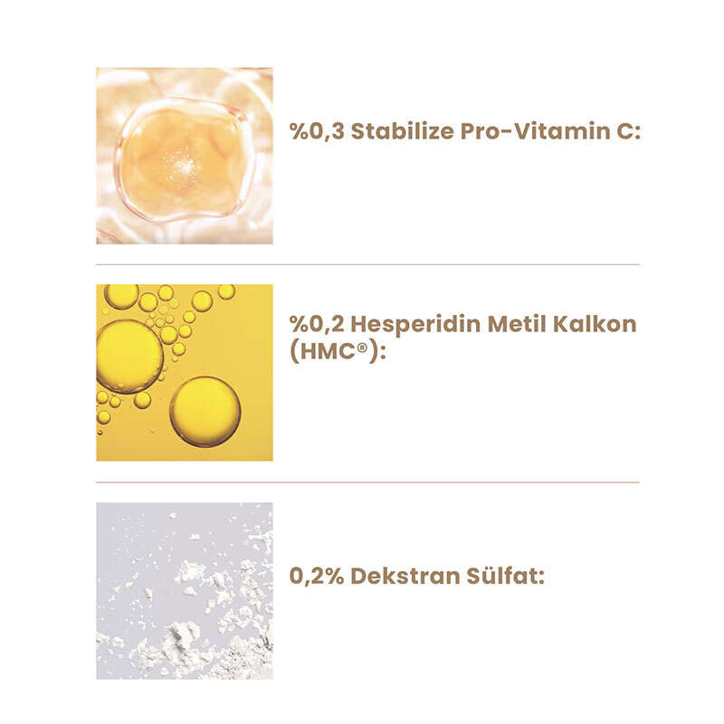 %0.2 Hesperidin Metil Kalkon (HMC®): Ciltteki leke görünümünün azalmasına yardımcı olur.