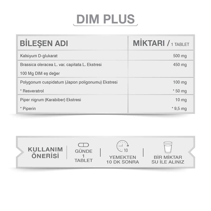 Kalsiyum D-glukarat, Brassica oleracea L. var. capitata L. (Lahana) ekstresi, Hacim artırıcı (Mikrokristalin Selüloz (E 460 (i)), Polygonum cuspidatum (Japon poligonumu) ekstresi (Resveratrol) , Stabilizör (Çapraz bağlı sodyum karboksimetil selüloz Polivinil Prolidon), Piper nigrum (Karabiber) ekstresi (Piperin), Topaklanmayı önleyici (Yağ asitlerinin magnezyum tuzları, silikon dioksit ).