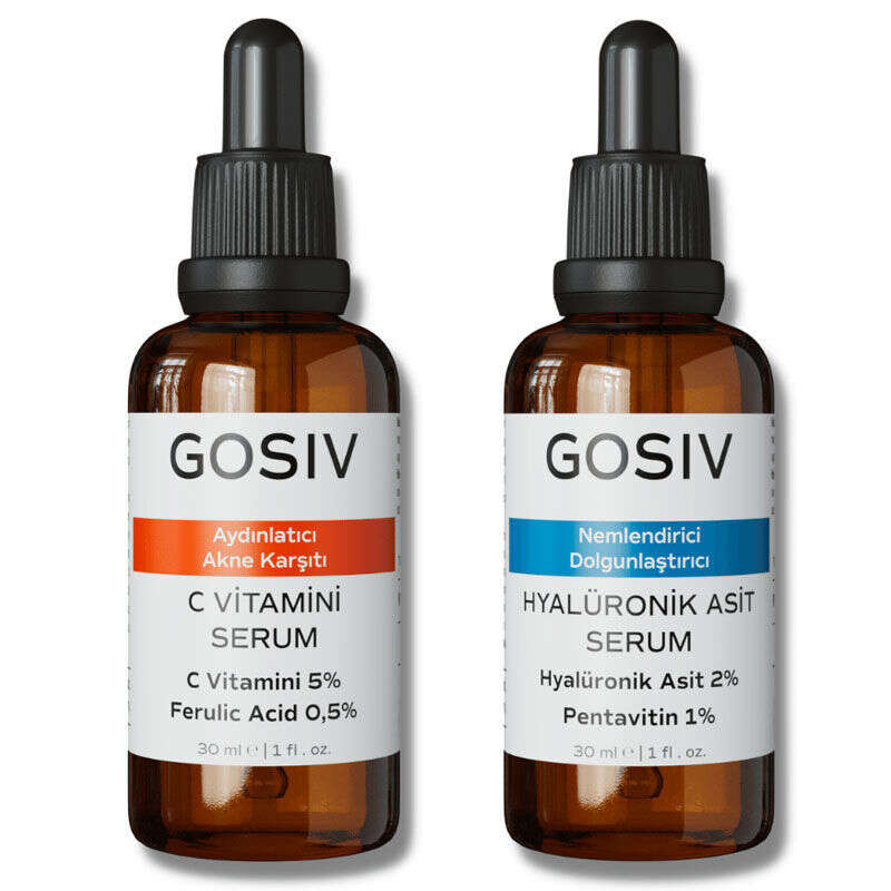 Gosiv Aydınlatıcı ve Düzensiz Ciltler İçin C Vitamini Serum 30 ml - Gosiv Nemlendirici ve Dolgunlaştırıcı Hyalüronik Asit Serum 30 ml
