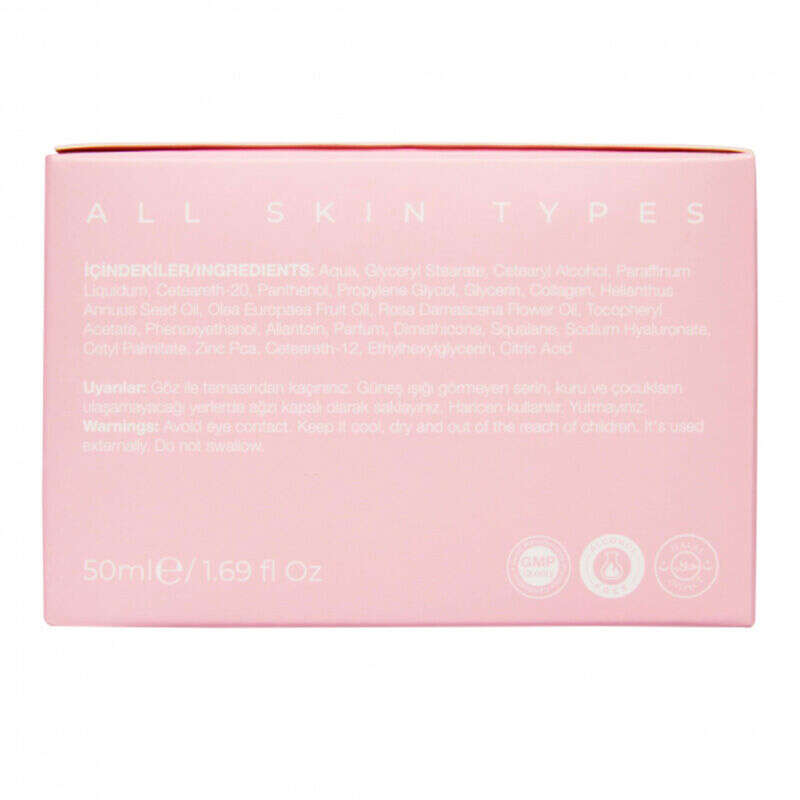 Aqua, Gliseril Stearate, Cetearyl Alcohol, ParaffinumLiquidum, Ceteareth-20, Panthenol, Propylene Glycol, Glycerin, Collagen, HelianthusAnnuus Seed Oil , Olea Europaea Fruit Oil, Rosa Damascena Flower Oil, Tocopheryl Acetate, Phenoxyethanol, Allantoin, Parfum, Dimethicone, Squalane, Sodium Hyaluronate,Cetyl Palmitate, Zinc Pca, Ceteareth-12, Ethylhexylglycerin, Citric Acid