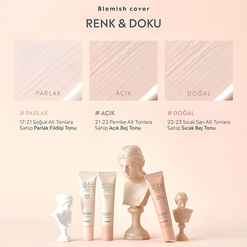 • Hanskin Blemish Cover, koyu halkaları görünümünü, renk eşitsizliklerini, pigmentasyonu ve diğer lekeleri etkili bir şekilde kapatmayı destekleyen, yarı mat bitişli bir kapatıcıdır.