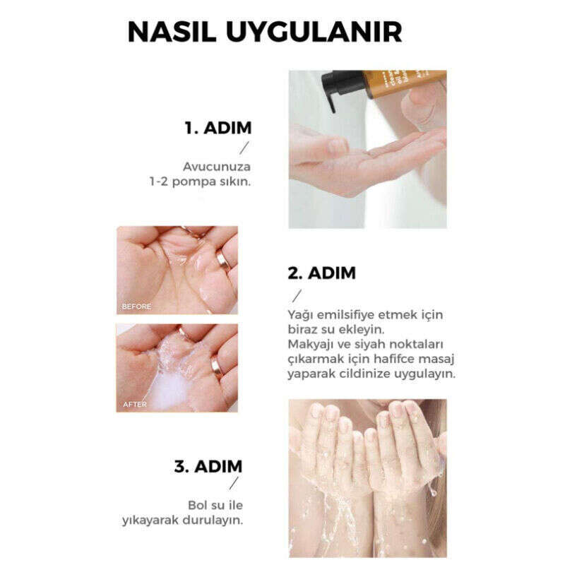 - Sonrasında elinizi ıslatın sütkıvamına gelen yağ ile makyajı ve siyah noktaları çıkarmak içi hafifçe masaj yaparak cildinize uygulayın.
