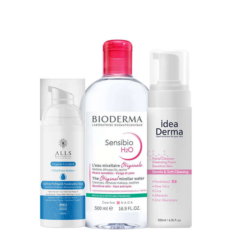 Bioderma Sensibio H2O Yüz ve Makyaj Temizleme Suyu 500 ml--İdea Derma Hassas Cilt Yüz Temizleme Köpüğü 200 ml--Alls Biocosmetics CicaVera Prebiyotik Nemlendirici Krem 50 ml