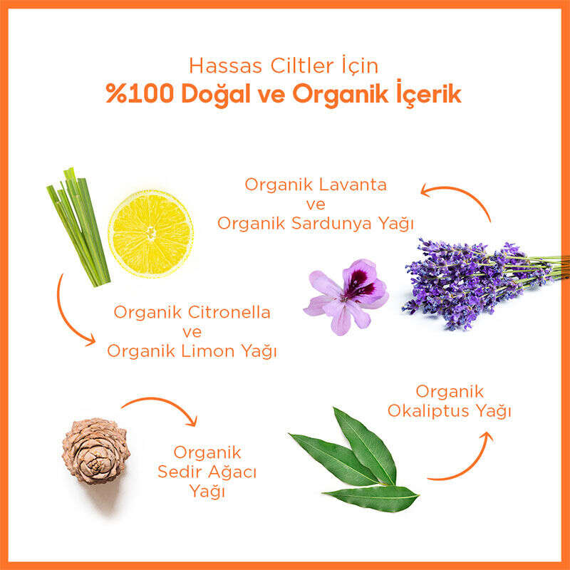 Ingredients: Aqua, Cymbopogon Nardus (Citronella) Oil**, Levulinic Acid*, Pelargonium Graveolens (Geranium) Flower Oil*, Cedrus Atlantica (Cedarwood) Wood Oil**, Citrus Limon (Lemon) Peel Oil**, Eucalyptus Citriodora (Lemon Eucalyptus) Oil**, Lavandula Angustifolia (Lavender) Oil***Bitki bazlı içerikler.**Organik sertifikalı içerikler