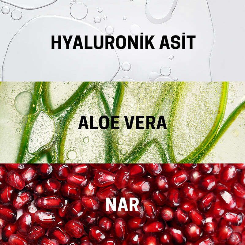 Hyaluronik Asit, Squalene, ve Aloe Vera ile cilt nemli ve tazelenmiş kalır.