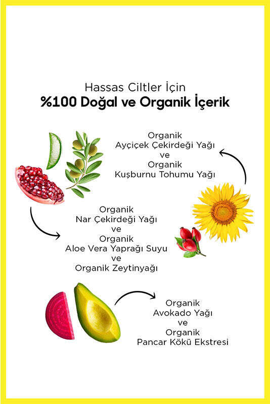 Buriti yağı, avokado yağı, nar ve kuşburnu çekirdeği yağı içeren bileşenler cildi besler ve nemlendirir.