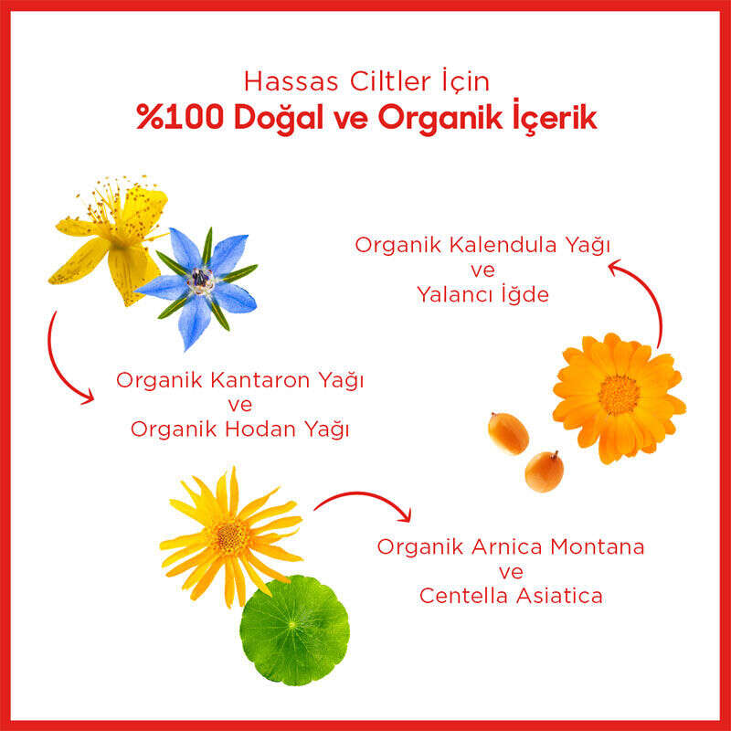 Centella Asiatica Özü, Arnica Montana Özü, Sarı Kantaron Yağı, Hodan, Yalan İğde ve Calendula Yağının güçlü etkisi sayesinde cildi korumaya yardımcı olur.