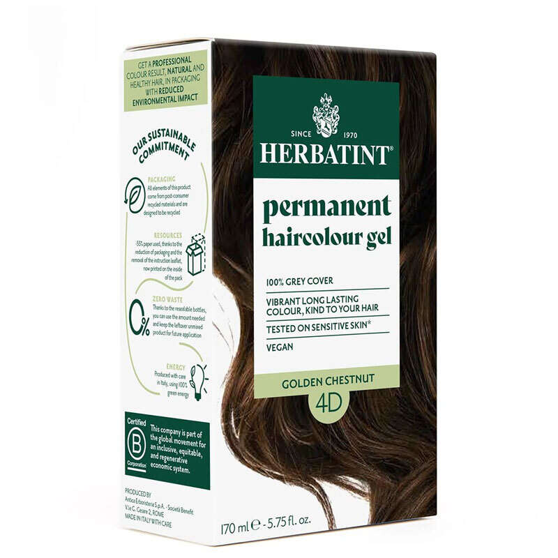 Herbatint 4D Altın Kestane, saç rengini kalıcı olarak değiştirmek, beyaz saçları %100 oranında kapatmak ve saça yoğun, doğal altın yansımalar kazandırmak için tasarlanmış dermokozmetik bir saç boyası jelidir.