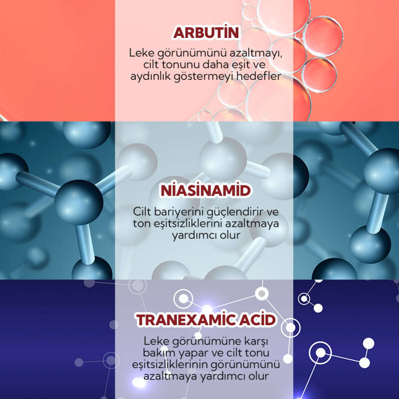 Arbutin, Niacinamide, Tranexamic Acid ve Potassium Azeloyl Diglycinate gibi aktif içerikler sayesinde ciltteki lekelerin ve renk düzensizliklerinin görünümünü azaltmaya yardımcı olur.