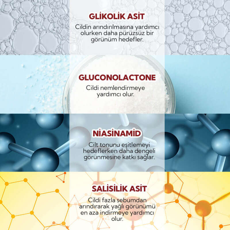 Salisilik asit ile cildi birikmiş sebumdan arındırarak yağlı görünümü azaltır.