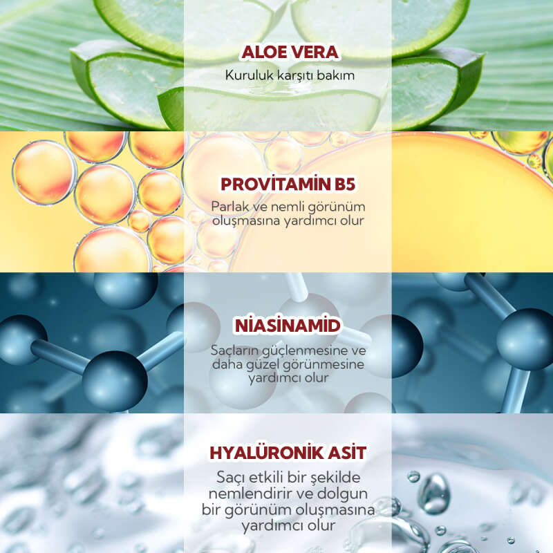 Niacinamide ve Provitamin B5 (Panthenol) gibi aktiflerle saç tellerini güçlendirir, saçın elastikiyetini artırır ve kırılmaları önlemeye yardımcı olur.