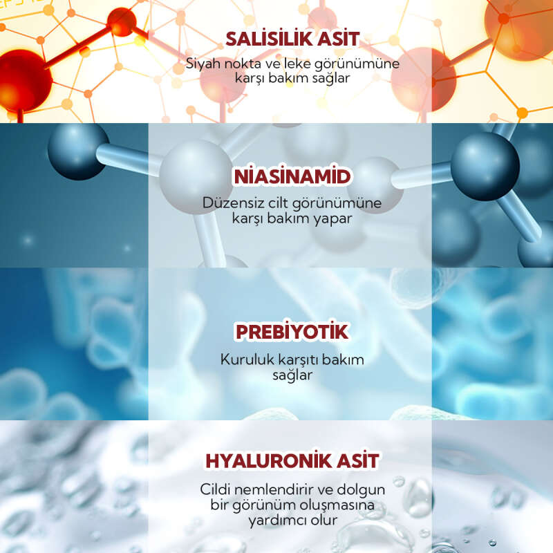 - İçeriğindeki niasinamid, çinko PCA ve çinko glukonat ile ciltteki gözenekleri küçültmeyi, cilt tonu eşitsizliklerini dengelemeyi hedefler.