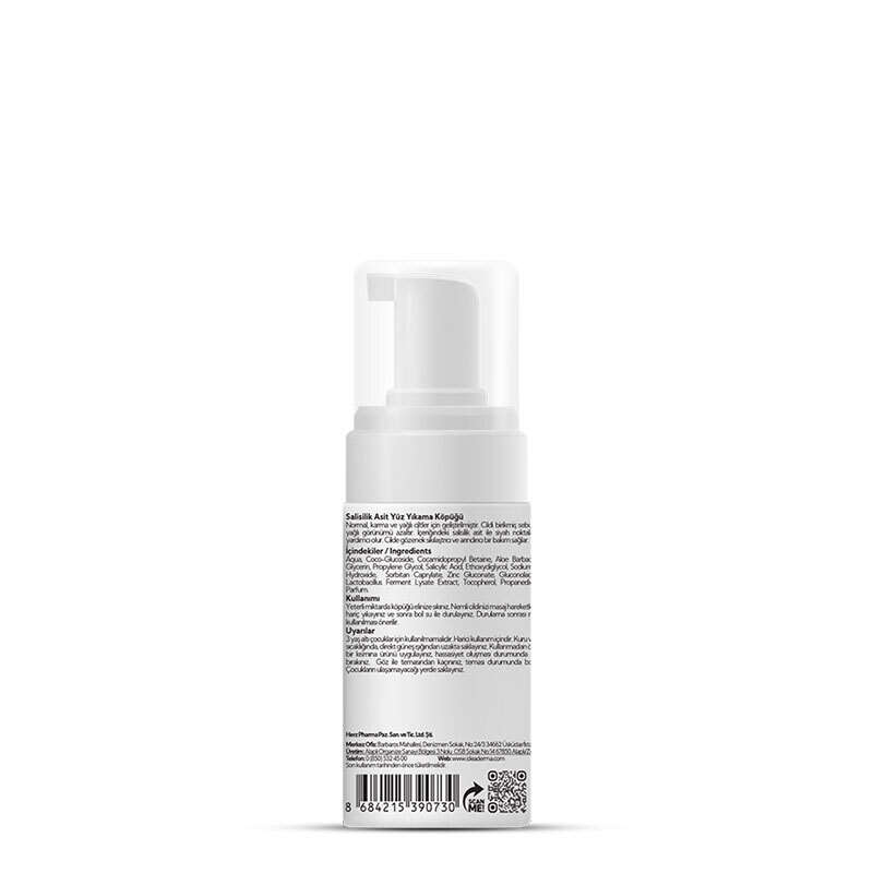 Normal, karma ve yağlı ciltler için özel olarak formüle edilen %2 Salisilik Asit içerikli yüz yıkama köpüğü temiz içeriğe sahiptir.