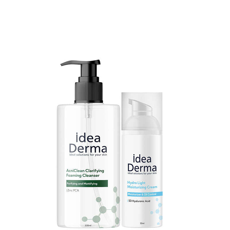 İdea Derma AcniClean Clarifying Foaming Cleanser 330 ml-İdea Derma 5D Hyaluronic Acid Hydro Light Nemlendirici Krem 50 ml
