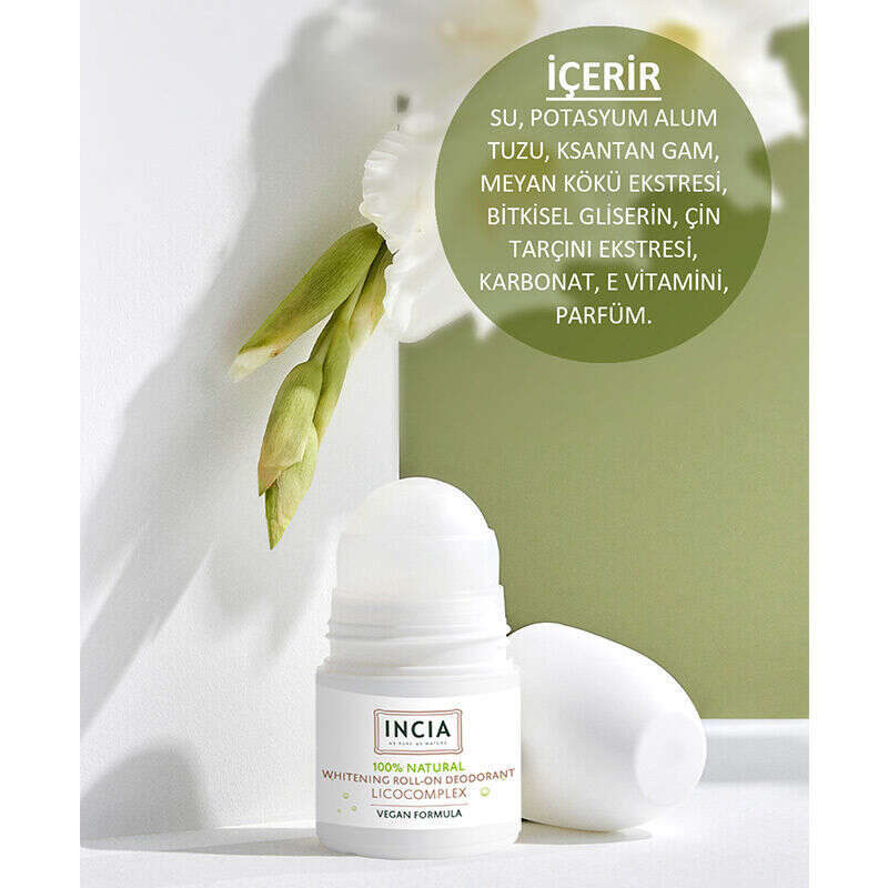 INCIA Beyazlatıcı Etkili Doğal Roll On Deodorant bir mineral tuz olan potasyum alum içerir.